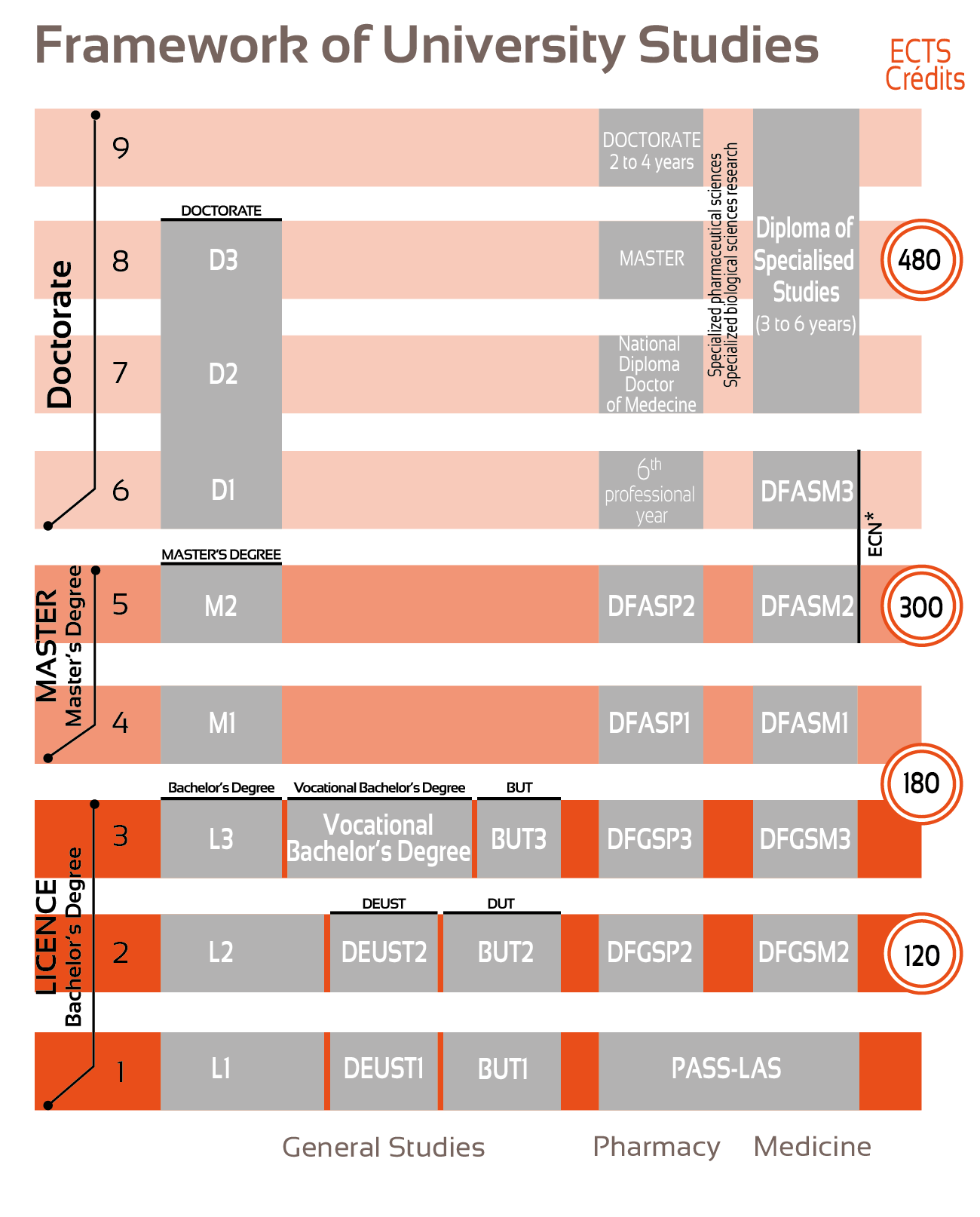 • Since 2002, the French university system has been based on the Licence-Master-Doctorat (LMD) system. This system facilitates the equivalence of diplomas in Europe, thanks to the European Credit Transfer System (ECTS).